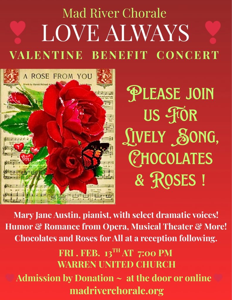 This concert helps raise funds for instrumentalists and soloists that enliven the December and May concerts of the Mad River Chorale. While the concert is free, donations are gratefully accepted either in-person at the concert, by mail, or online.