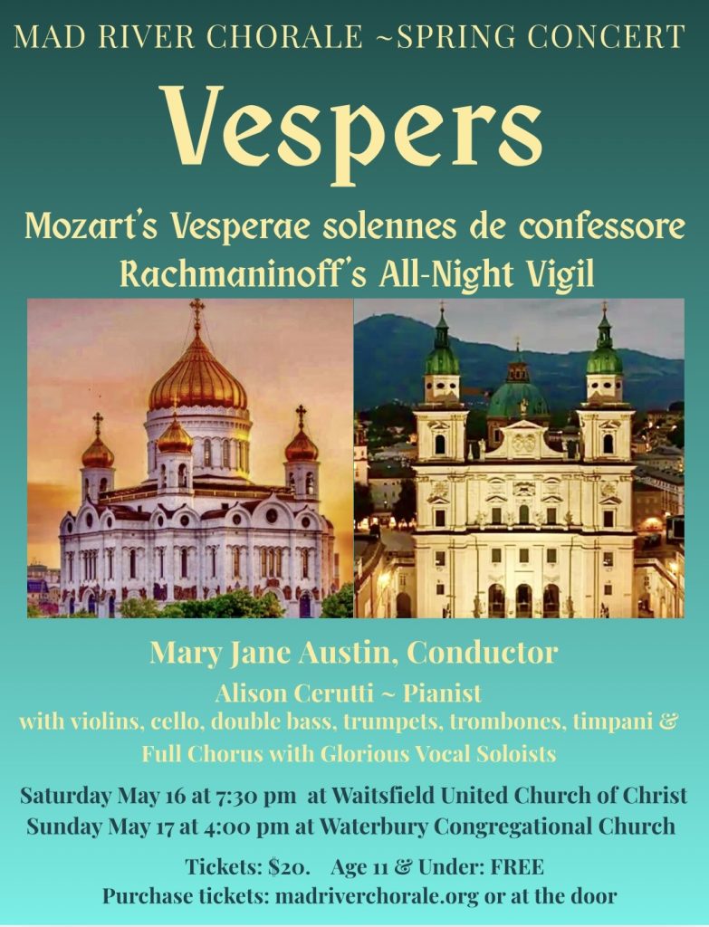 Our Spring semester will focus on two compositions – one by Mozart and one by Rachmaninoff – for “Vespers” or evening prayer. While this liturgy has been practiced for centuries by various Christian denominations, vespers can also refer to the secular or a religious practice of quiet contemplation in the evening hours.